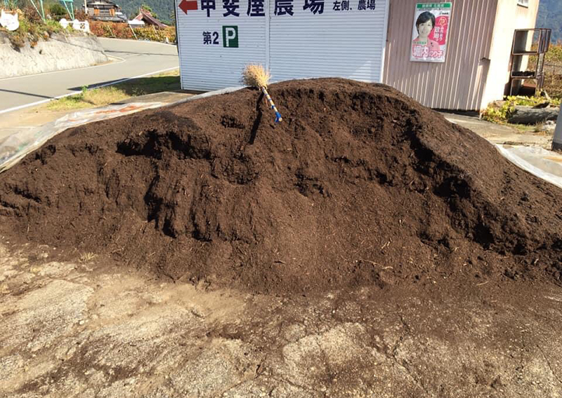 袋に入った有機肥料と、トラックでもらう堆肥の両方をぶどう園にまきます。たくさんの美味しいぶどうを付けてくれてお疲れさま!ありがとう!